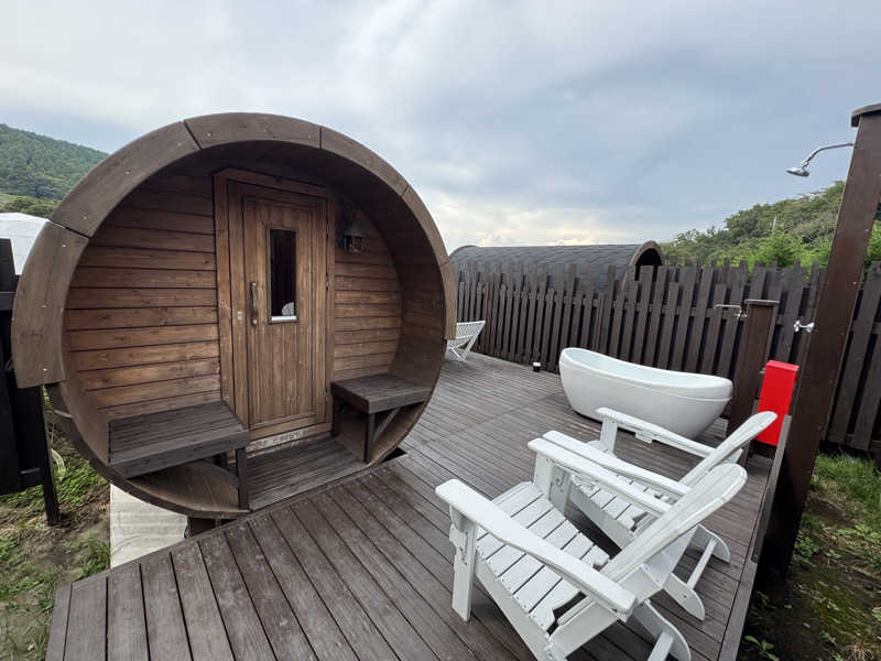 オプションのバレルサウナに申し込みましたが1人で貸し切り状態でした。値段は少し張りますが、その価値は十分にありました。サウナはセルフロウリュウも可能で100℃近くになり、アチアチです。水風呂は蛇口からの水道水なので温浴施設のような冷たさはないですが、ちょうど良い感じでした。屋外なのでロケーション含め、ととのいスペース最高です🧖🥵