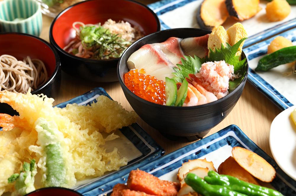 「出雲蕎麦」は島根県で広く食べられる郷土料理で、風味の強いそば粉を使用した濃いお蕎麦です。出雲の伝統的な「割子」という器に入れて「割子蕎麦」でお召し上がりください。また、合わせて季節の回線を盛り込んだ「お好み海鮮丼」もご用意しております。