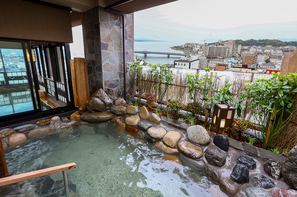 天気の良い日には、露天風呂から松江宍道湖に沈む夕日を一望。露天風呂や2つの壺湯、ととのいスペースで心地よい風を感じながら、ゆったりとした時間をお過ごしいただけます。